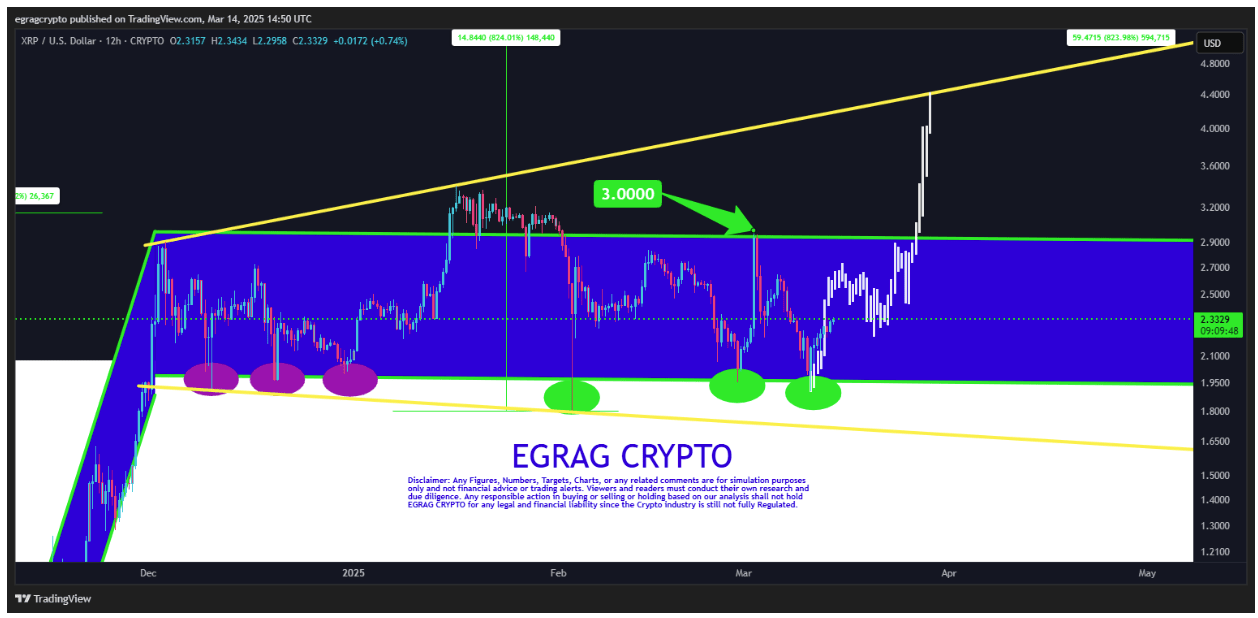 March has been particularly bearish for XRP, with sellers maintaining control as it failed to reclaim lost ground. However, if XRP bulls manage to close above $3 before the end of the month, it will open up the door for the resumption of a price rally. With this in mind, Egrag set an initial target of $4.80, placing XRP at new all-time highs.