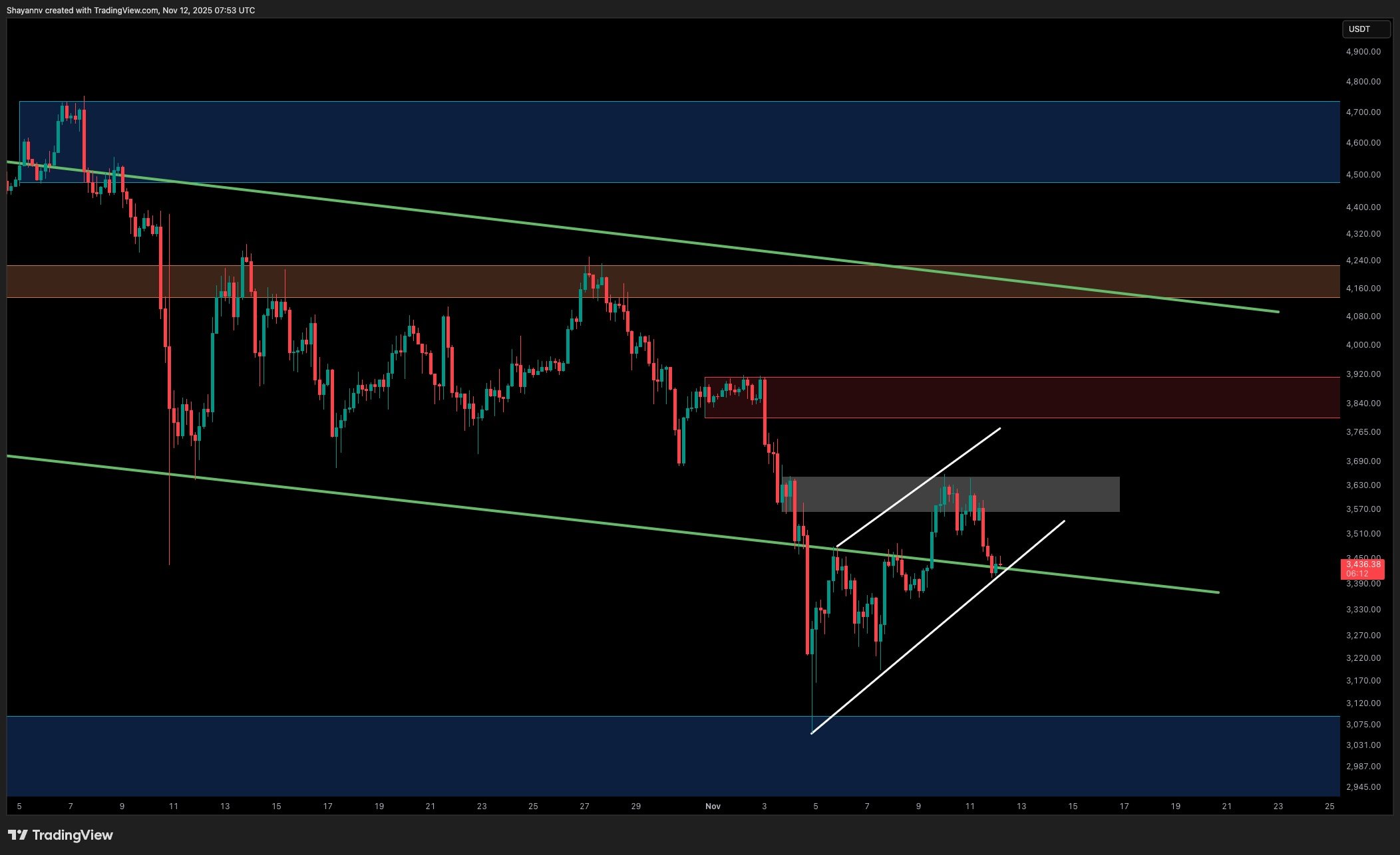 The next key liquidity area sits around $3.2K–$3.3K, overlapping with the midline of the daily descending channel. This region could serve as a potential reaction base for short-term buyers if selling pressure intensifies. However, a clean break beneath this support would shift focus toward the $3.0K–$3.1K macro demand, the same level seen in the daily structure as a historically significant accumulation area.